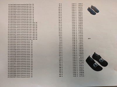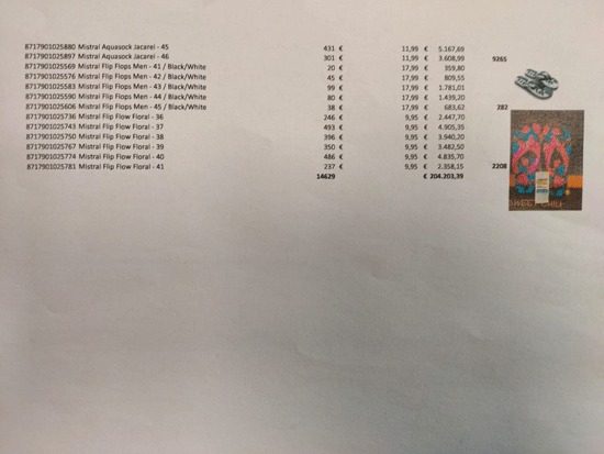 تقریباً 3000 جفت کفش کتانی راحت بهاره و تابستانی که به تفکیک 2300 دمپایی زنانه، 282 دمپایی مردانه و 9000 دمپایی بچه گانه از 2 تا 3.5 یورو موجود میباشد.